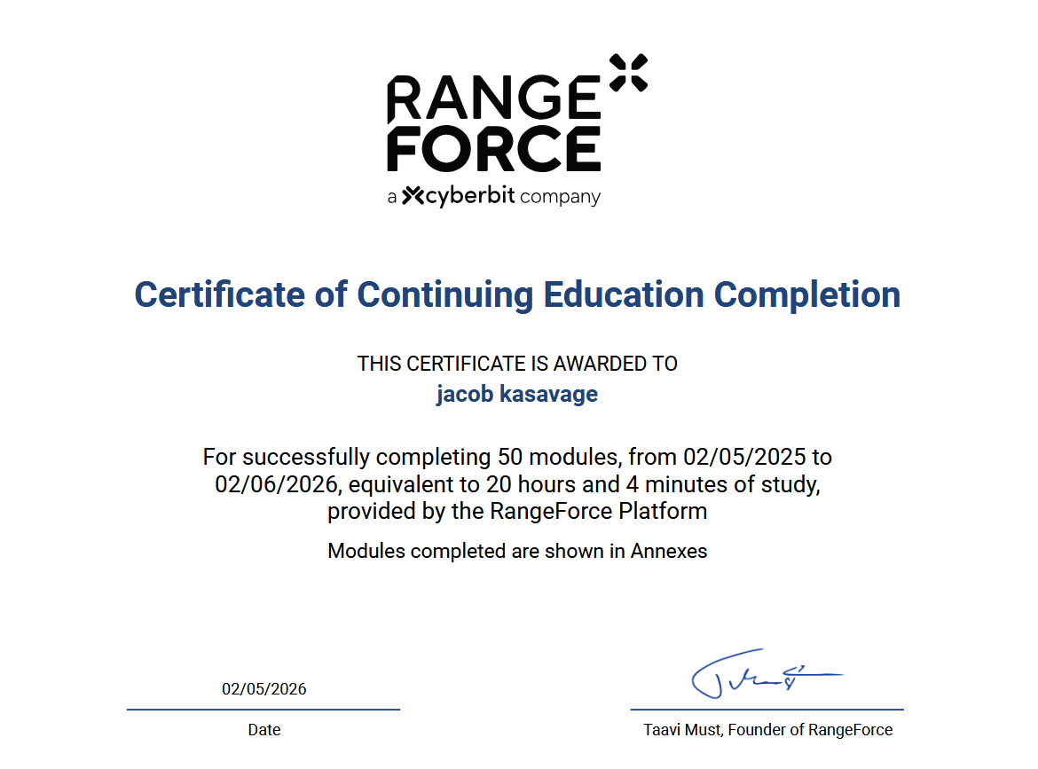 Showcasing my cybersecurity education journey through Rangeforce themes and professional certifications